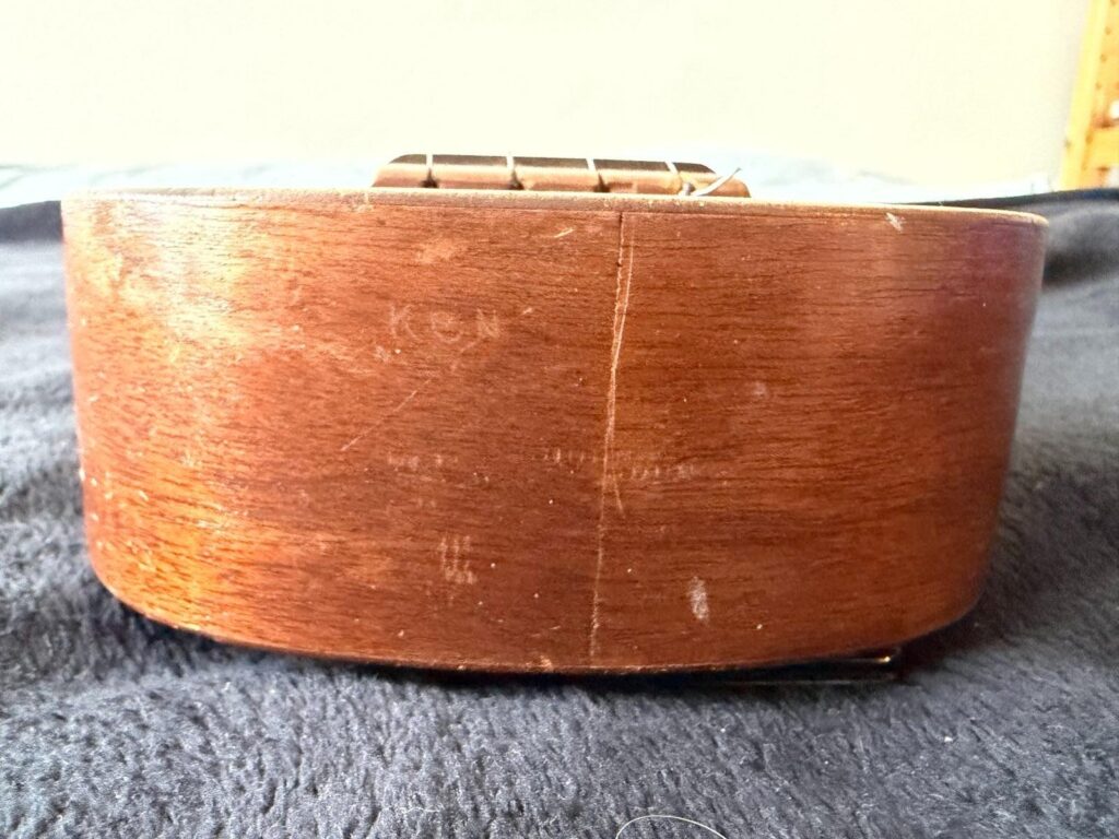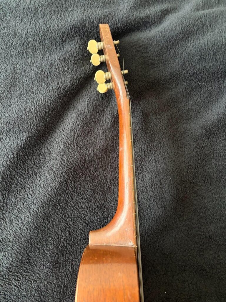 古い楽器にありがちな傷や擦り傷、小さなへこみ、細いひび割れ(写真では見えにくいかもしれません)がいくつかあります。ブリッジも多少摩耗していますが、100年近く前のビンテージ楽器としてはかなり良い状態で、大きな問題はないと言えます。しっかりしており、現状のままで演奏可能です。
