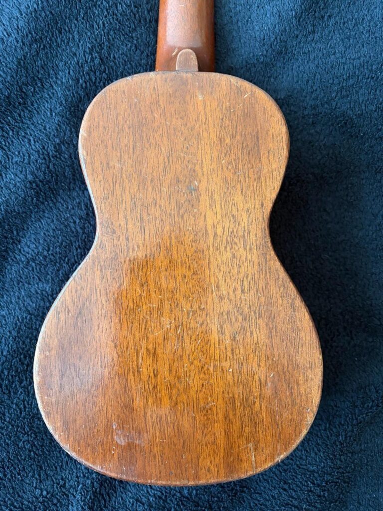ビンテージのギブソン・スタイル1ソプラノウクレレをご紹介します。マホガニー単板にローズウッドのフィンガーボード。製造年代については、楽器の状態からおそらくは20年代のものと思われますが、「The」のついた「The Gibson」のロゴがはっきりと確認できることから、少なくとも1908~1937年 (~1934年という説もある)に製造されたものだということははっきりと言えます。