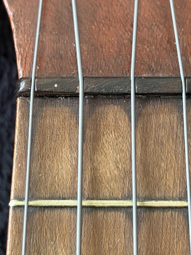 - 黒檀製のナットとサドル。ナット幅1-3/8 inch(約3.5 cm)